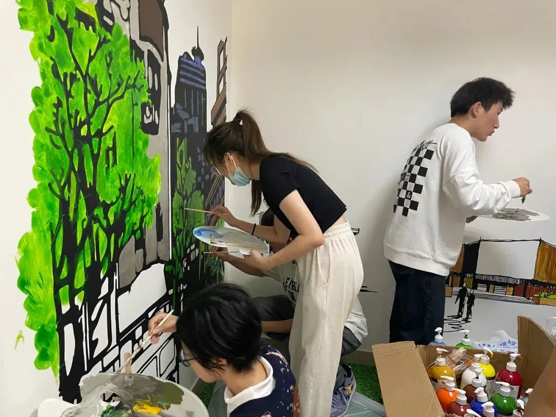 上色、勾線、填充……一個個地標建筑躍然眼前。日前,由同濟大學十幾個學科組成的“城市360”空間改造團隊,為遷址不久的延吉新村街道社工站進行墻面彩繪。