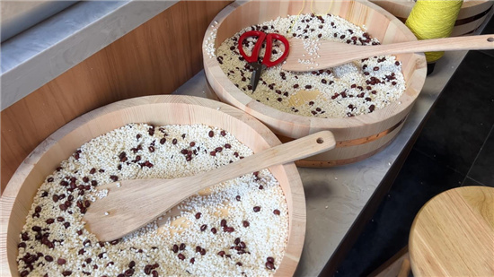 店內的體驗區,工作人員正在帶領游客體驗包粽子的樂趣,“首先我們要將粽葉挽成漏斗狀……”孩子們一個個興致高昂,跟隨工作人員的動作在“漏斗”中依次加入糯米,再攥緊粽葉。家長們則在一旁興奮地拍下視頻,向親朋好友展示著孩子的“杰作”?!疤幸馑剂?,雖然包的不好看,但能讓孩子們一邊動手制作,一邊傾聽粽子和端午節背后的故事,比在家吃更有意義?!庇慰完惻空f道。