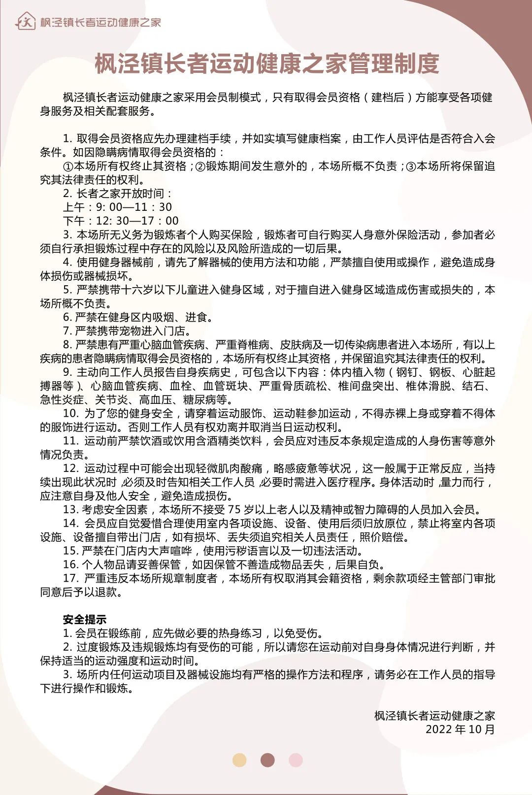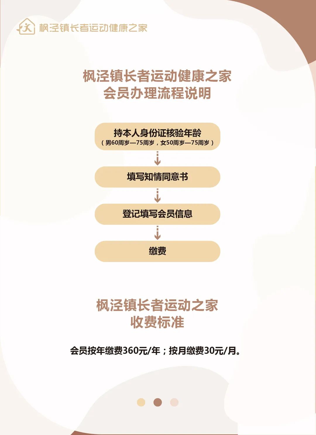據悉,楓涇鎮長者運動健康之家實行公益性收費,開放時間為每天9:00-11:30、12:30-17:00,對會員的年齡要求為男性60周歲至75周歲,女性50周歲至75周歲。目前采用年卡和月卡兩種收費模式,收費標準分別是360元/年,30元/月。