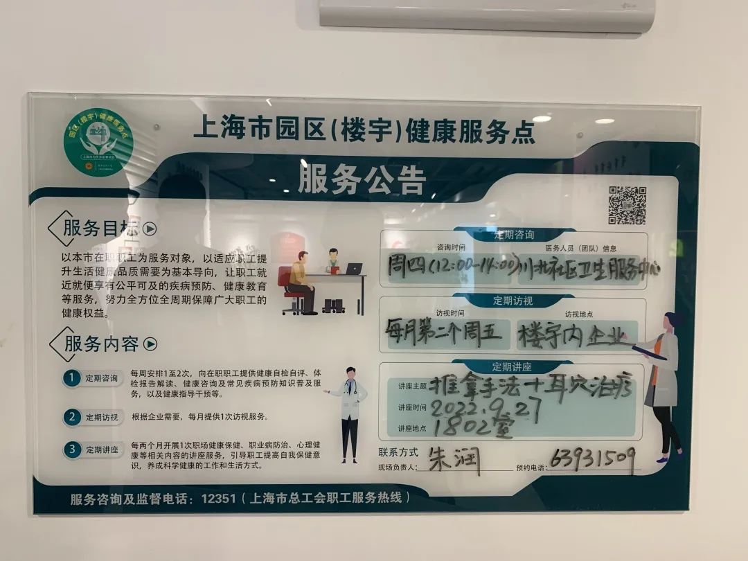 而園區(樓宇)健康服務點,旨在讓職工就近就便享受疾病預防、健康自檢自評、健康教育指導等服務,保障廣大職工的健康權益。