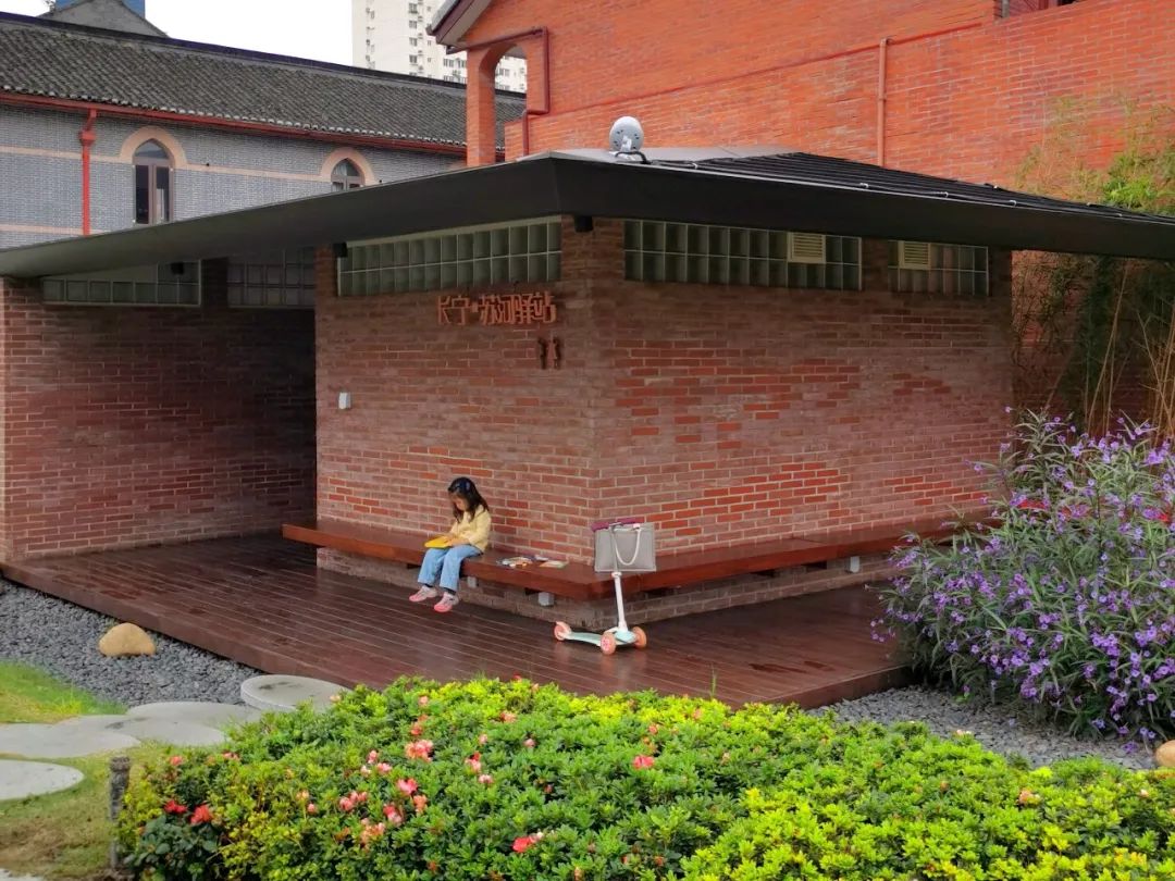 蘇州河華政段最初貫通開放時并未設置公共座椅和衛生間,不少市民在游覽過后提出希望可以增設相應設施的意見。于是,區建管委在推進建設蘇州河華政段“一帶十點”景觀時,將各種配套服務設施融入這處不過900米的濱水空間中,如桃李園的異形木質座椅、法劇場的石椅、書香園的圖書館和咖啡館,以及倚竹苑的這處長寧·蘇河驛站等。