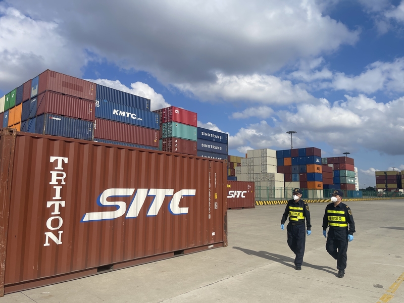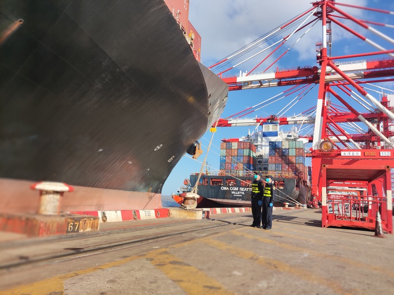 外港海關關員保障“離港確認”模式水水中轉進口貨物安全快速放行。(殷嘯峰 攝)
