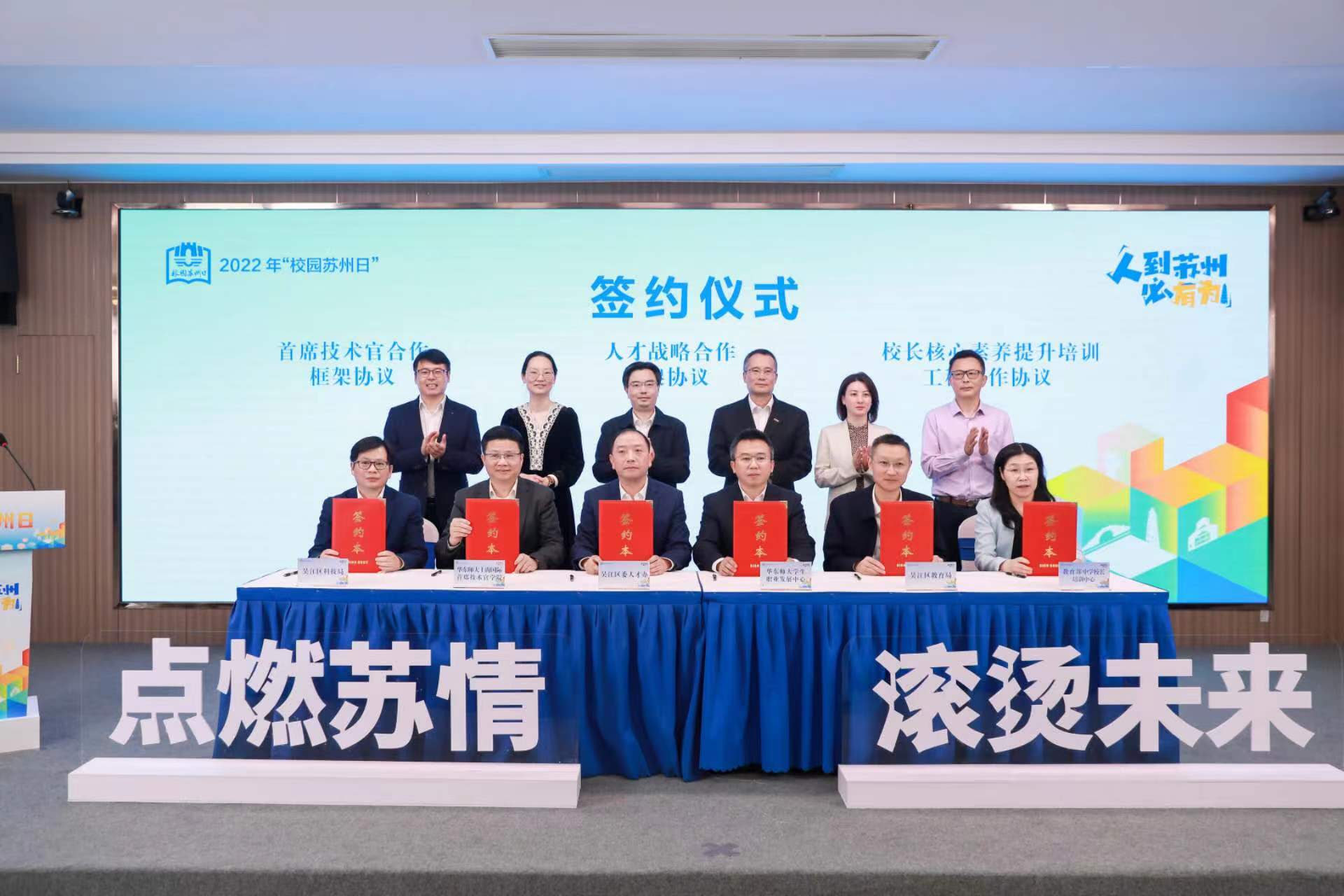 活動現場,人才戰略合作框架協議、校長核心素養提升培訓工程合作協議、首席技術官合作框架協議等一批合作共建協議正式簽訂,華東師范大學青年人才創新實踐基地落地吳江。一系列合作通過搭建政策互惠、資源共享平臺,加快實現校地人才互通,為華東師范大學的畢業生來吳就業提供“高速通道”。