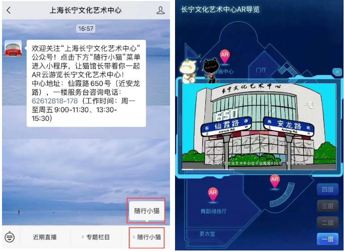 除了長寧圖書館,長寧文化藝術中心同樣也有“數字”加持。去年,長寧文化藝術中心推出AR數字化導識系統——“AR隨行小貓”。該系統被嵌入在中心官方微信公眾號的電子菜單中,以小程序的形式呈現,點擊“隨行小貓”即可進入。