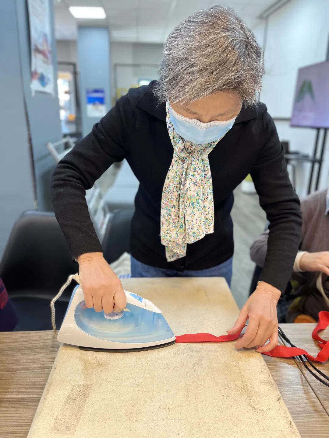 而另一位志愿者把紅色的包邊仔細熨燙,然后把作品用紅線滾邊。大家分工合作,一塊塊彩布在她們的“巧手”下變成了一幅幅精美而喜慶的布藝壁飾。