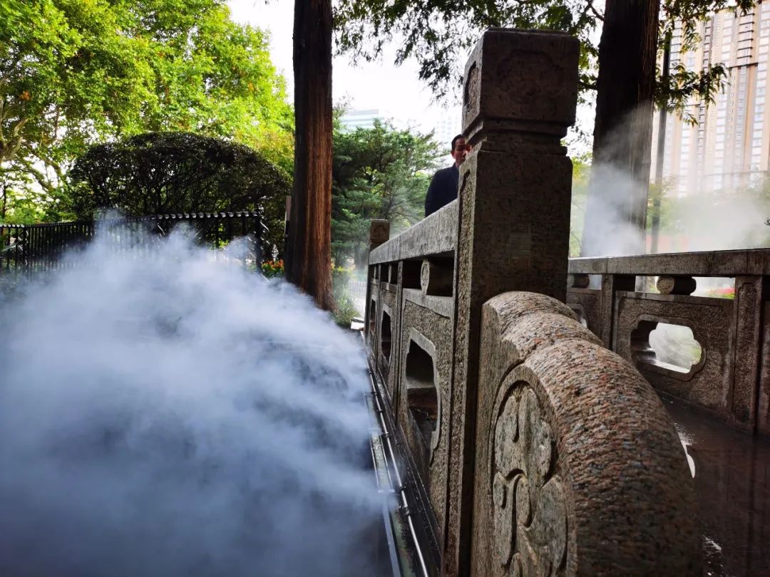 輕柔的白霧如少女身披紗衣輕撫池中水,時而嫵媚,時而柔美,千姿百態,讓人頓時覺得遠離了城市的喧囂,此刻水景噴霧景觀只屬于置身其中的人。伴隨著蟲鳴鳥叫,清脆悅耳,好不自在!