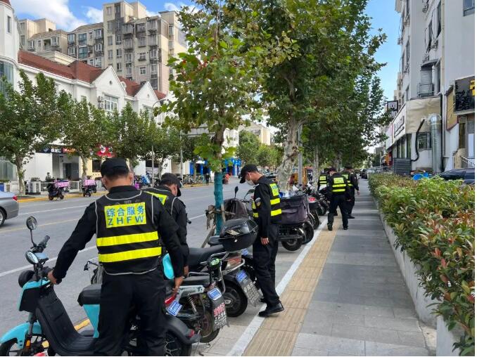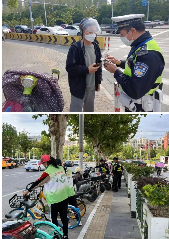 鎮交警五大隊在車流、人流量較大路口嚴查電動自行車未懸掛牌照(無牌無證)、騎乘人未佩戴安全頭盔、逆向行駛等違法行為。鎮市容辦對亂停放的非機動車進行整治,將共享單車、外賣電瓶車等停放整齊。志愿者在教育路等路口引導居民過馬路、提醒過往行人注意遵守交通規則。