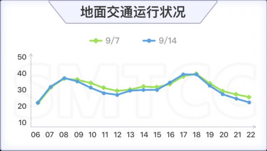9月14日晚高峰受臺風“梅花”影響相對較大,中心城快速路流量明顯下降,中心城快速路、外環內地面晚高峰 的交通指數較9月7日略有下降。