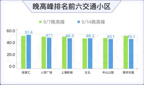 9月14日地面晚高峰交通指數區域與9月7日較一致,晚高峰交通指數下降1%。徐家匯的晚高峰擁堵指數最高,較9月7日上升4%,為排名前六中增幅最大;南京西路晚高峰交通指數排名由9月7日的第二下降至第六,交通指數下降10%,為排名前六中指數下降幅度最大。