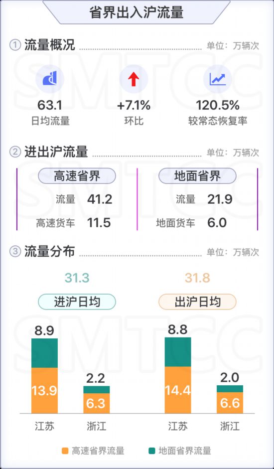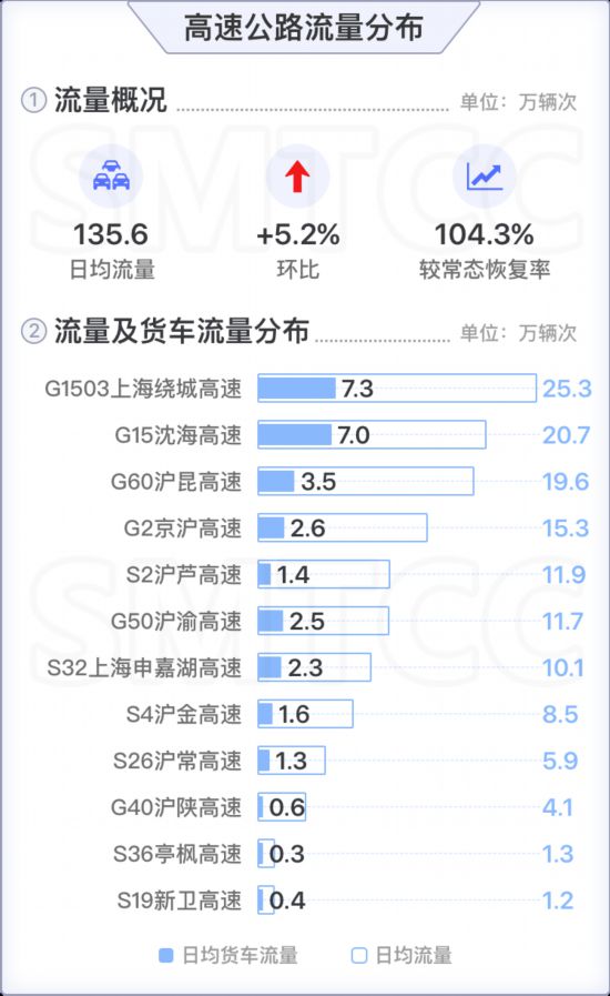中心城快速路日均流量為197.4萬輛次,環比上升2.5%,恢復至常態的96.9%;高速公路日均流量為135.6萬輛次,環比上升5.2%,略超過常態。