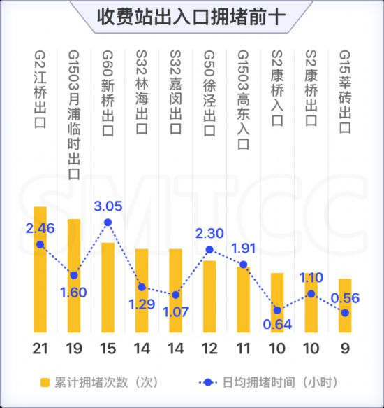 高速公路有28個收費站出入口出現過擁堵,擁堵頻次排名前十的收費站詳見下圖。