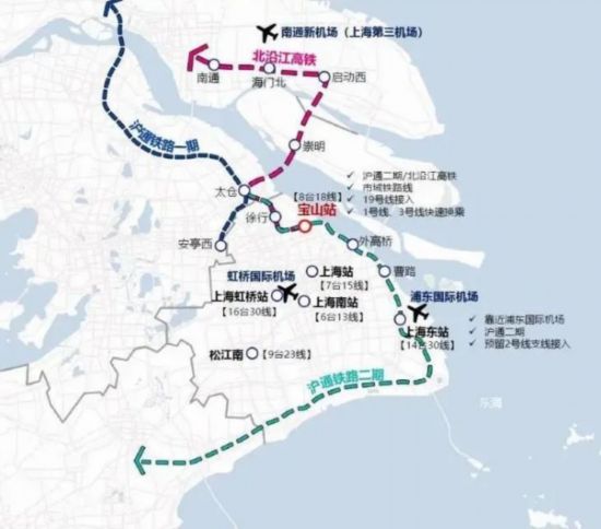 這條高鐵在上海的新建車站其中,上海寶山站將成為上海的北部鐵路樞紐規劃站場規模為8臺18線超過上海南站和上海站的規模