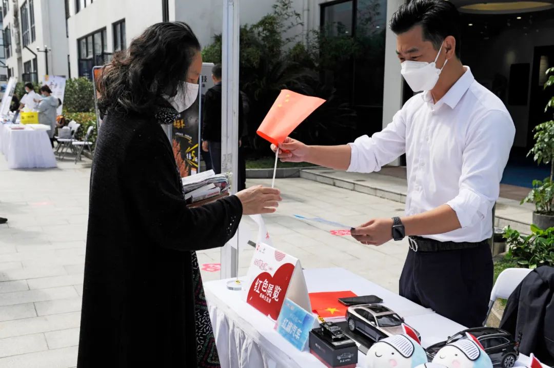 此外,參觀者還紛紛與開進園區的“紅旗”牌轎車合影留念。紅色主題展覽區通過一系列沉浸式互動方式,帶領大家重溫黨的革命歷史,傳承紅色精神。