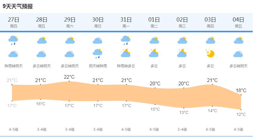 昨夜今晨降水比較明顯,全市普降小雨。預計今天上午開始雨水減弱,以陰到多云為主,偶有分散性小雨。全天氣溫在17~21℃之間。東北風4~5級。相對濕度90%~60%。體感依舊舒適。