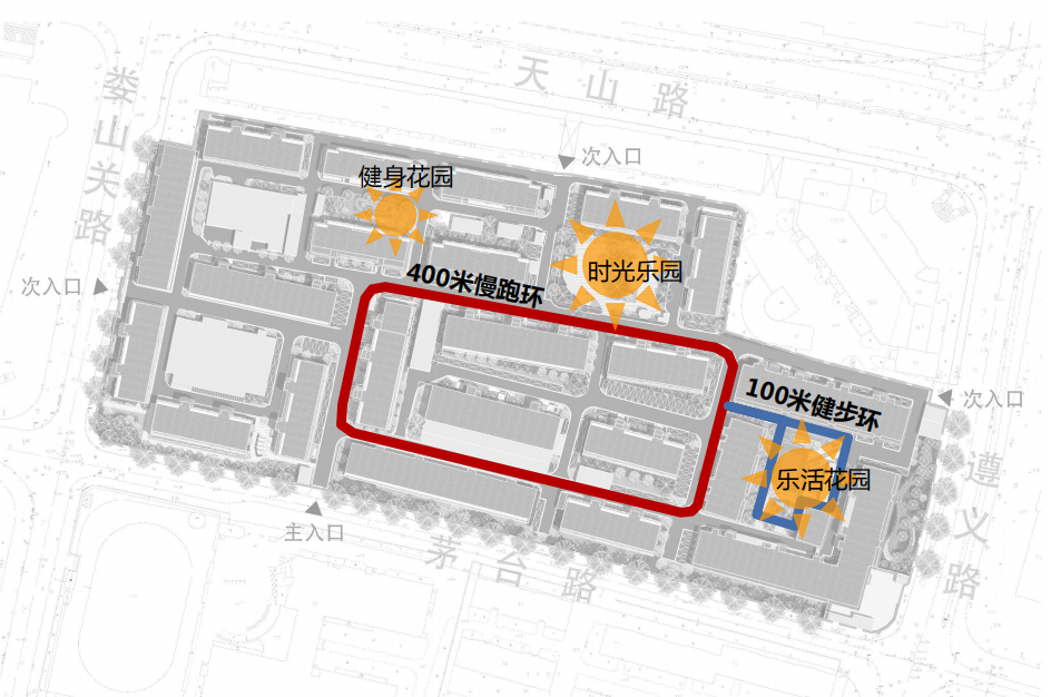 結合天山二村居民區的實際情況和場地特色,此次精品小區建設將呈現健身花園、時光樂園、樂活花園和100米健步環、400米慢跑環五大特色場景,形成“兩環三園”的特色景觀。其中,“兩環”的設計考慮到居民區內老年人口較多的特點,讓老年人出門即是專業步道,既滿足日常運動需求,也能進一步確保安全,此外也為社區青年運動慢跑提供了便利;“三園”則是保留新打造的時光樂園,將此處營造為安靜愜意的老年人休憩場所,同時打造樂活花園,最大程度保留現狀設施,對鋪裝及坐凳進行更新改造,吸引社區居民休閑活動;另外,利用綠化空間打造康養和健身花園,增添休憩功能和寵物活動功能,滿足西片區居民休閑活動需求的同時,提高社區花園的服務覆蓋率。