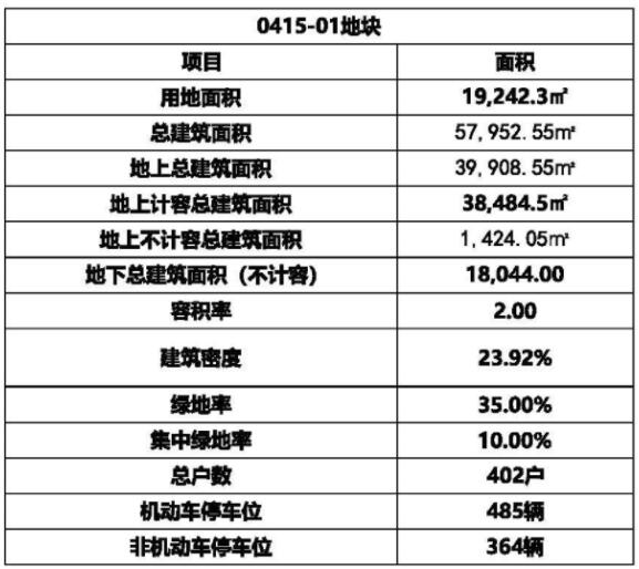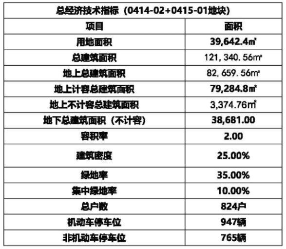 0415-01和0415-02地塊用地面積39642.4平方米,總建筑面積121340.56平方米,總戶數824戶,設有機動車停車位947輛,非機動車停車位765輛。