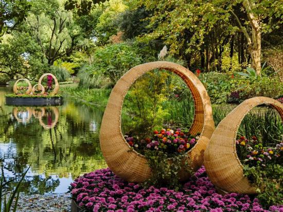 原花藝館及華明橋南側等河岸區域以水景森林為主題,充分利用公園優美的水系環境,在河岸邊布置以菊花材料為主的自然花境,打造林下空間的野趣菊花美景。