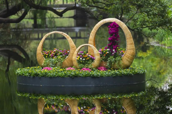 河面結合主題布置菊花立體造型,菊花造型在湖水的映襯下呈現曼妙婆娑的菊花倒影,烘托出森林公園的唯美秋季景色。