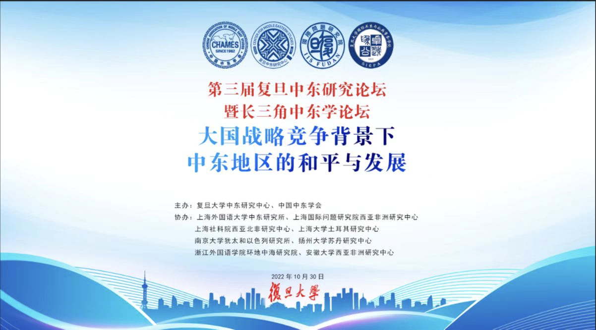 人民網上海10月31日電? 10月30日,第三屆復旦中東研究論壇暨長三角中東學論壇召開。此次論壇由復旦大學中東研究中心和中國中東學會主辦,上海外國語大學中東研究所、上海國際問題研究院西亞非洲研究中心、上海社科院西亞北非研究中心、上海大學土耳其研究中心、南京大學猶太和以色列研究所、揚州大學蘇丹研究中心、浙江外國語學院環地中海研究院、安徽大學西亞非洲研究中心等8家單位協辦。論壇主題為“大國戰略競爭背景下中東地區的和平與發展”,來自全國50多家單位的100多名學者參加了會議,線上聽眾近300人。