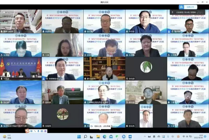 論壇上,中國前中東問題特使吳思科大使、中共中央對外聯絡部三局副局長余偉分別作了專題報告。上海社科院國際問題研究所所長王健主持主旨發言,中國前駐卡塔爾大使高有禎、浙江外國語學院國別和區域研究中心主任周烈、中國社科院西亞非洲研究所政治研究室主任唐志超、上海社科院國際問題研究所副所長余建華、上海外國語大學中東研究所教授劉中民、上海國際問題研究院研究員李偉建、北京語言大學國別和區域研究院院長羅林、上海外國語大學中東研究所所長丁俊、西北大學中東研究所所長韓志斌、陜西師范大學歷史文化學院院長李秉忠先后發言,中國前駐伊拉克、敘利亞、沙特大使李華新作了點評。