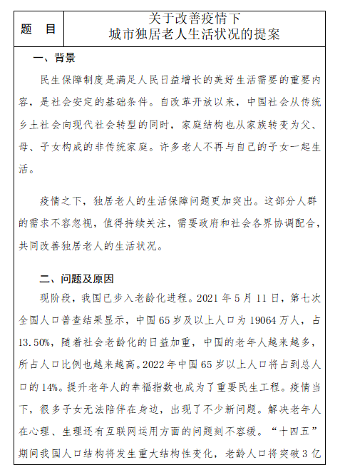 關于改善疫情下城市獨居老人權利和生活狀況的提案
