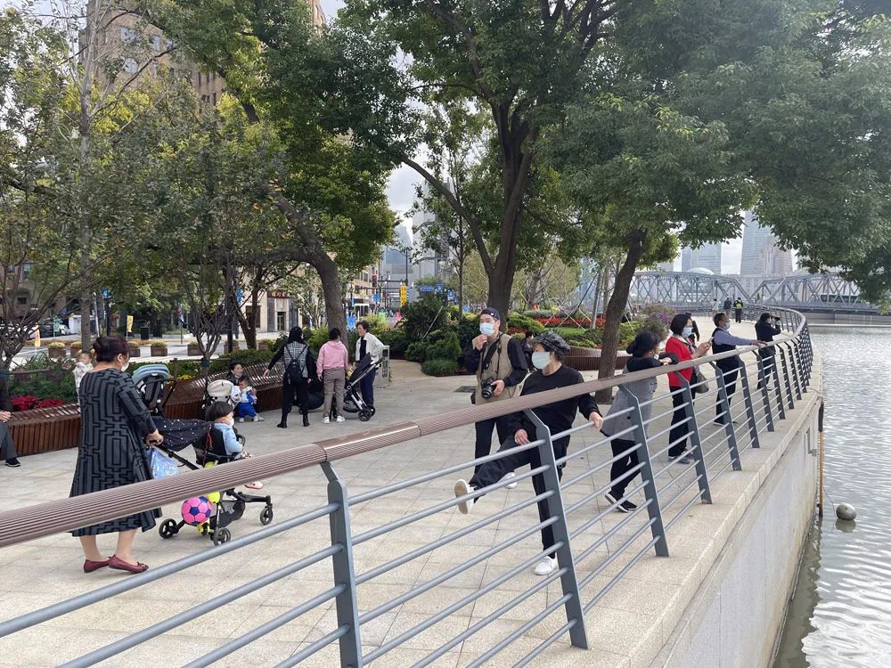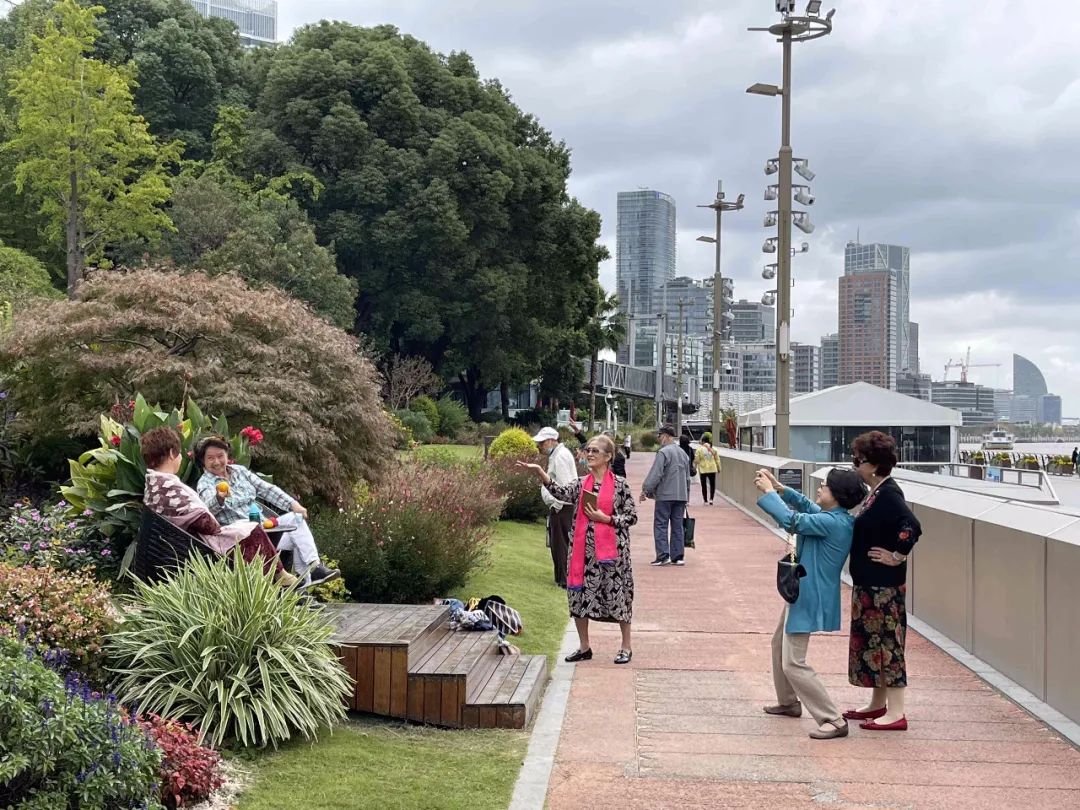 不少阿姨媽媽更是組團前來拍照,面前是無敵江景,背后是五彩斑斕的綠化,加上人性化的休閑座椅等設施,令拍照的阿姨們流連忘返。拍照、動作指導、表情互動,歡聲笑語洋溢在秋日下的北外灘。
