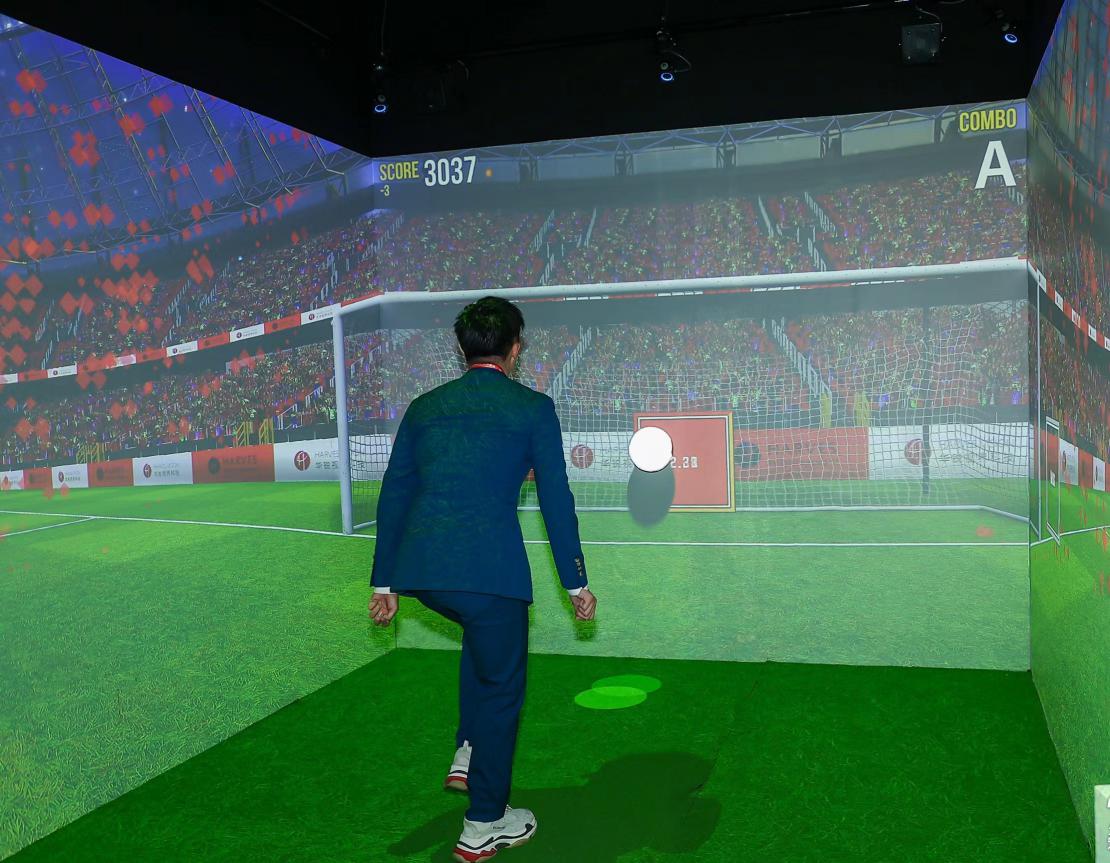 以打印機設備見長的愛普生將一個沉浸式足球場搬進了進博會現場。在一方密閉的空間內,愛普生運用原創3色液晶顯示激光投影技術,結合視覺捕捉軟件的輔助,體驗者可以突破時空限制,置身于一片綠茵場,眼前還有一位不收時薪,24小時在線的虛擬陪練。體驗者將足球射向“球門”,守門員可以立時作出反應……