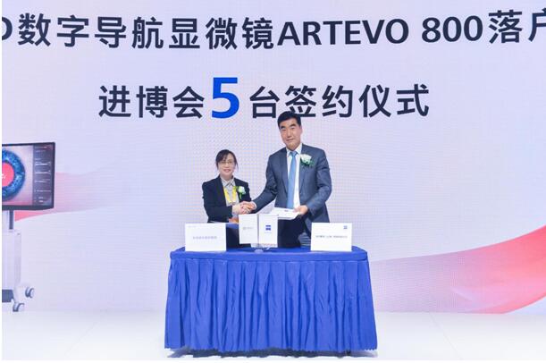 手術過程中,醫生戴上3D 眼鏡,就能通過立體真實呈現手術視野的4K55寸顯示屏,清晰識別眼組織結構,實時監控手術的每一個細節,輕松診斷細微病變。進博會上,普瑞眼科率先引進了5臺集數字光學、實時導航、3D手術功能于一體的蔡司ARTEVO 800眼科導航手術顯微鏡。據悉,這也是蔡司全球首款3D數字化眼科導航手術顯微鏡首次亮相進博會。