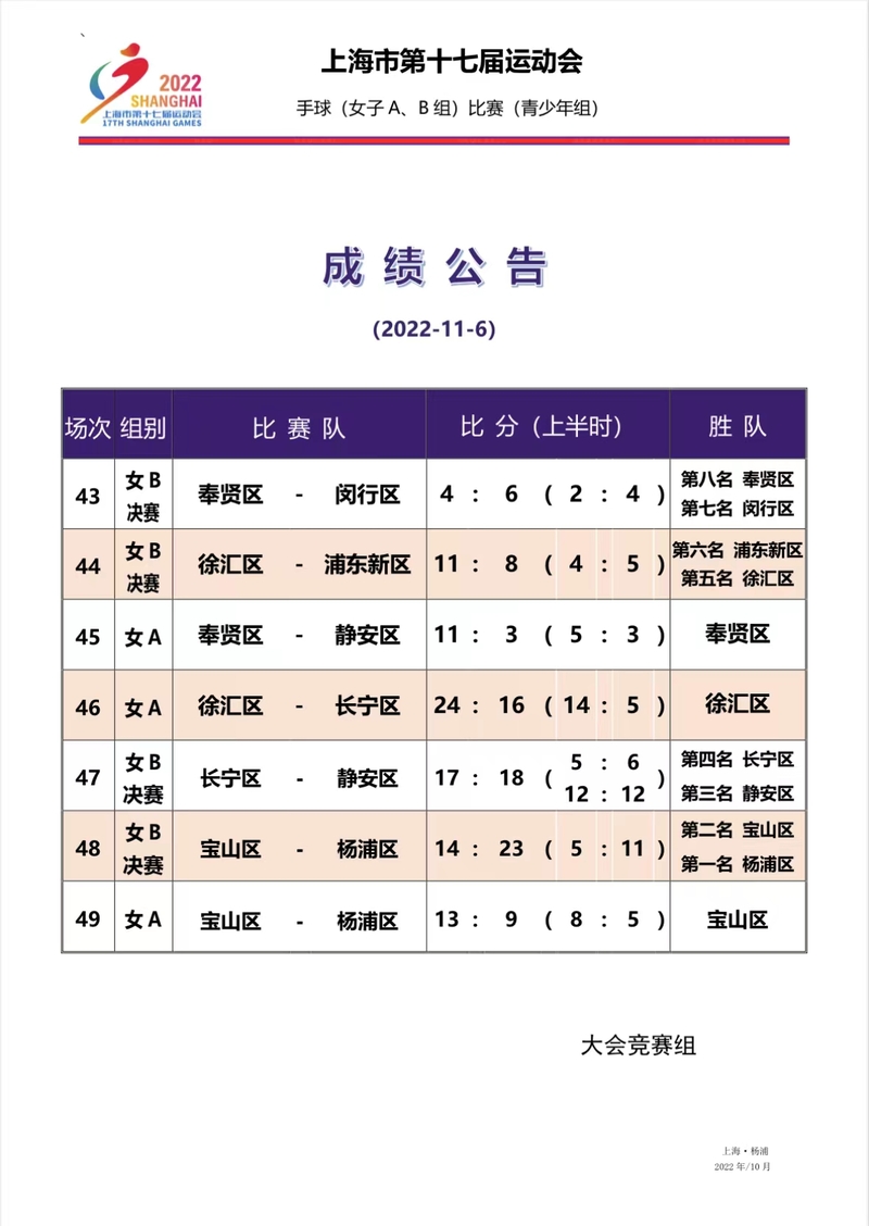 過去的這個周末,上海市第十七屆運動會(青少年組)手球(女子A、B組)比賽圓滿收官,來自全市9個區的女子手球小運動員們用昂揚的斗志、飽滿的競技狀態為四年的辛苦備戰奮力拼搏。經過激烈的角逐,楊浦區最終以23:14的比分戰勝寶山區摘得B組冠軍,女子手球A組冠軍由寶山區獲得,楊浦區獲得亞軍。