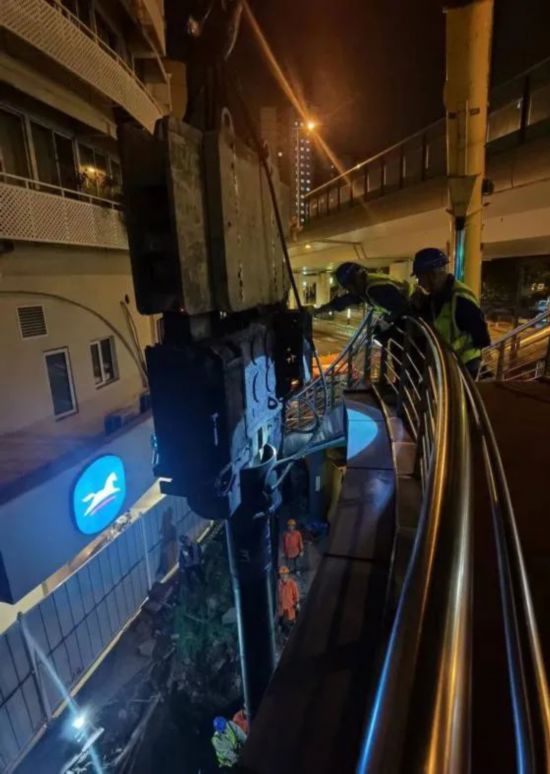 市道運中心對延安路7座人行天橋新增25部垂直電梯,解決無障礙跨越延安路的同時,也解決跨越西藏路、成都路、江蘇路等行人過街的安全問題,為本市同一路段加梯數量之最。前期設計初始,反復調研調整,優化細磨方案,平衡用地和管線搬遷關系,每個象限比選2至3個方案,最終確定一梯一方案,有針對性的解決各類復雜的管線搬遷問題。面對用地緊張、工序復雜、施工難度高等問題,優化交通組織方案,合理安排工序;施工中還遭遇離地鐵隧道、電力管廊僅2-3米等困難,為確保安全,項目團隊采用環保降噪的高頻免共振鋼管樁施工工藝,經過持續一個月夜間奮戰,完成施工難度最大的43根鋼管樁施工。