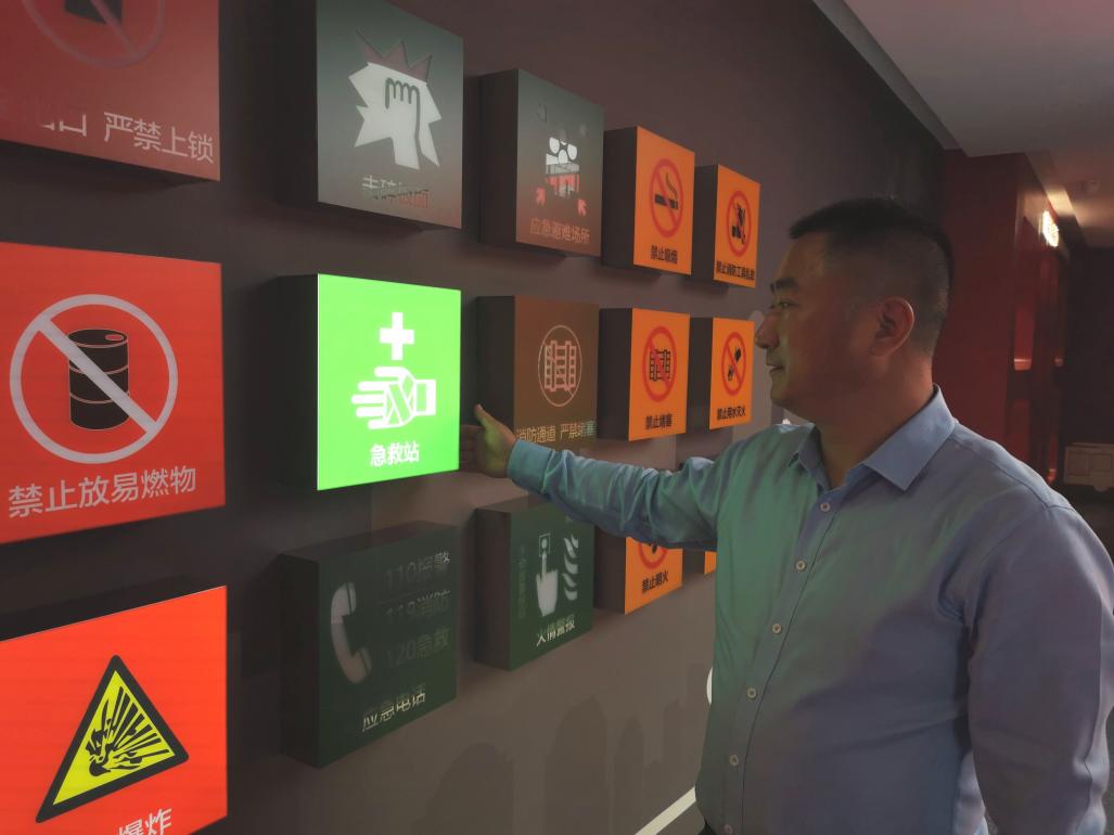 在火災疏散逃生演示墻板塊,通過墻體畫面配合交互性極強的油墨導電,還原火災初起、初期自救、電話報警、逃生措施和組織救援的全流程。參觀者可用手指觸碰電瓶充電交互點、電話報警交互點、逃生繩索交互點等互動按鈕,獲得相應流程的動態反饋。