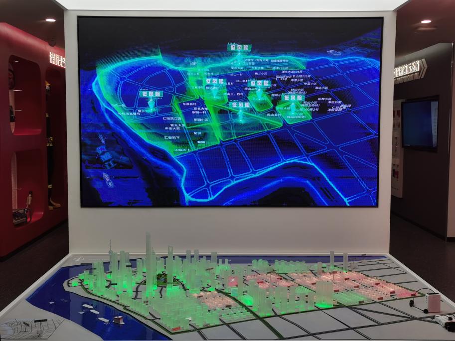 體驗館入口處,沙盤模型將陸家嘴地區的火災風險等級分為高、中、低三個級別,高、中風險主要分布在老舊小區,低風險主要分布在高層樓宇,參觀者可通過觸摸屏查詢不同區域的火災風險等級。