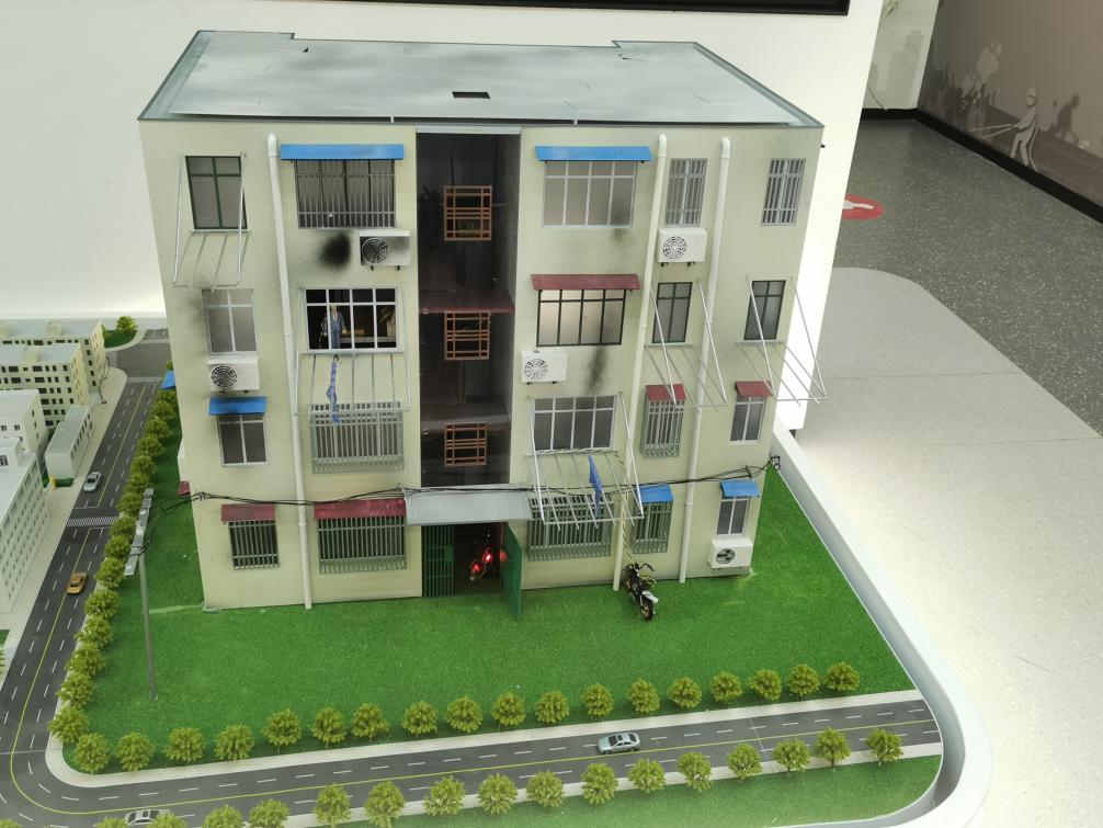 在社區火災隱患模擬板塊,體驗館以上海某真實小區為原型,制作社區模型,放大展現老舊社區的消防隱患。參觀者通過觀看視頻、點擊屏幕互動,將獲得對樓道堆物、私家車占用消防車道、電動車飛線充電、社區電線線路老化等消防隱患的直觀感知。