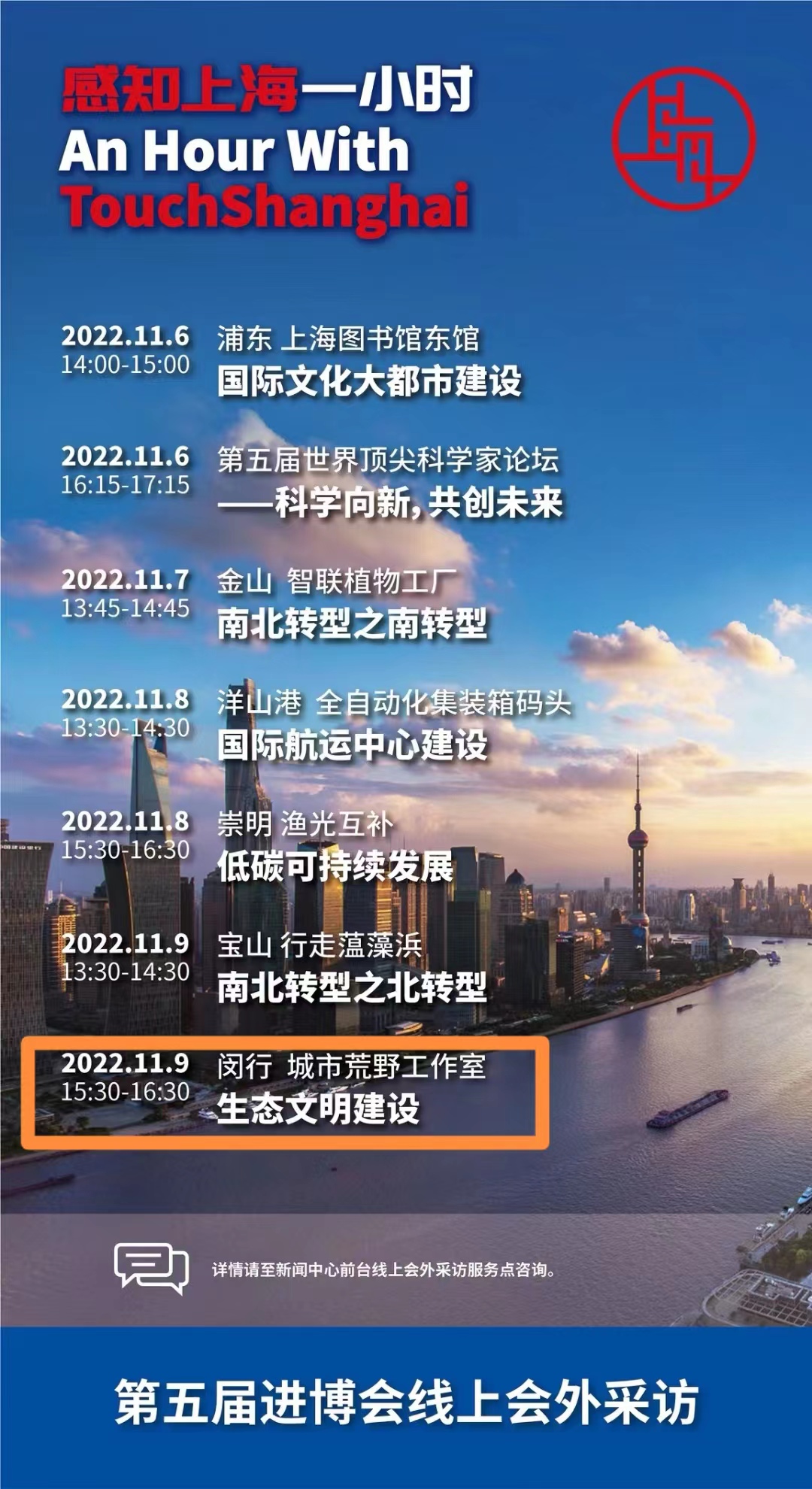 為發揮進博會“溢出效應”,生動展現上海底蘊特色和城市轉型發展,上海市政府新聞辦會同各區新聞辦在第五屆進博會期間組織開展“感知上海一小時”線上會外采訪活動。今年的會外采訪不同于往年,通過線上直播的方式,打破時間和空間的限制,讓新聞采訪更加“觸手可得”。