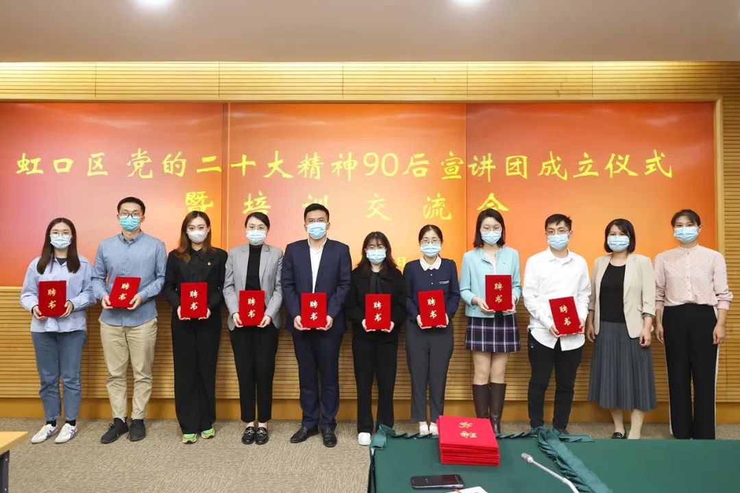 11月10日下午,虹口區黨的二十大精神90后宣講團成立儀式暨培訓交流會舉行,近三十位90后代表在線下參與了培訓,并收到了區委宣傳部、團區委發出的聘書。