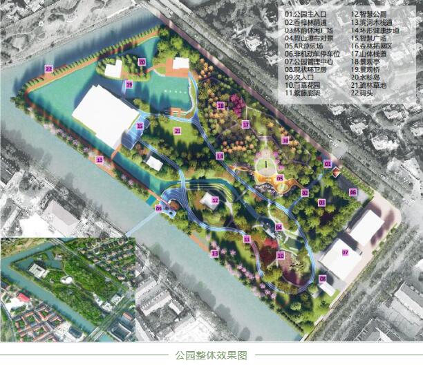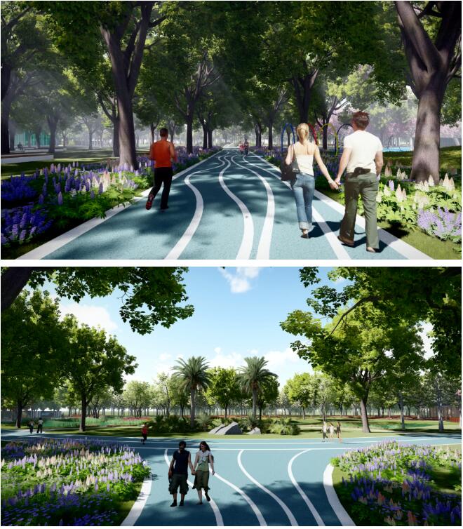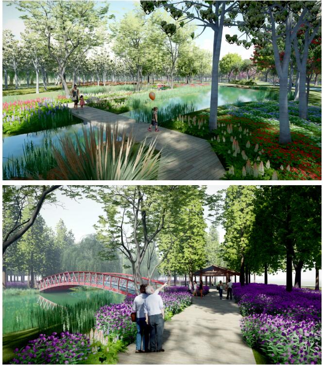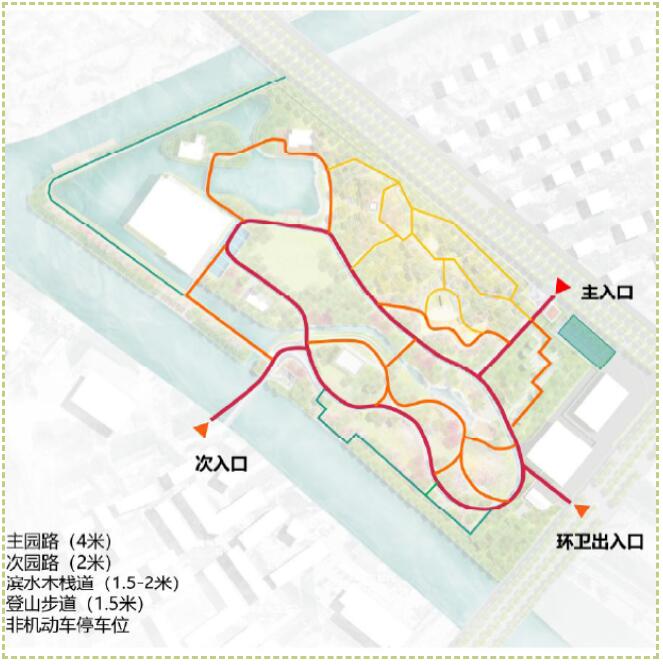 公園開放后將設置2個出入口,主入口位于羅迎路,入口處的小廣場和林蔭休閑場地可以提供人流疏散、拍照等空間,同時也提升了公園的入口形象。次入口于荻涇增設一處人行景觀橋,可與北歐風情街相連,市民可從即將開工的人行橋進入公園。