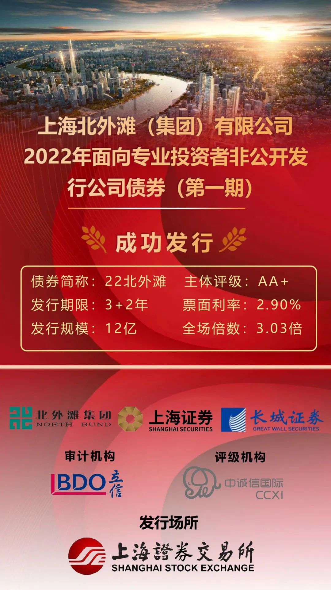 2022年11月10日,北外灘集團在上交所面向專業投資者非公開發行12億元、3+2年期公司債(債券簡稱“22北外灘”),利率2.90%,創造了上海市AA+評級同品種3年以上信用債票面利率歷史最低記錄。全場認購總額36.4億元,倍數3.03。此次發行由上海證券擔任主承銷商、簿記管理人,長城證券擔任聯席主承銷商。