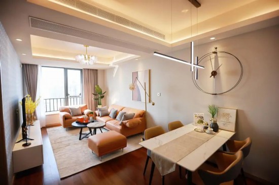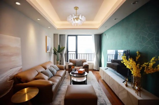客廳內的兩面墻壁上都是大窗戶,采光很好;全屋沙發、餐桌、床椅等家具,以及冰箱、洗衣機、電視、中央空調等電器,一應俱全。