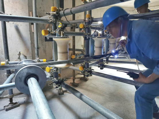 然而,要建成這樣一項高難度的電網工程,也少不了前期的技術論證工作?!拔覀優槌瑢щ娎|量身定制各種施工工藝和敷設機械,超導電纜結構與傳統電纜不同,對通道的精度和環境要求也較高!”國網上海市南供電公司項管中心副主任王明俊介紹。為此,市南公司還開展試拉試驗,現場包括一段縱向高差3米的電纜溝橋和1個90度水平轉角通道,復原了實際電纜敷設中難度最大的路段?!俺瑢щ娎|試拉試驗的成功,意味著超導電纜敷設環節技術的重大突破,彌補國內相關技術空白?!蓖趺骺≌f。