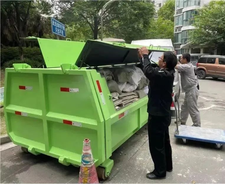 長寧區綠化市容局聯合局屬西聯環衛公司與北新涇街道商議,決定在北新涇街道元豐小區,共同試點探索使用可移動式“智能裝修垃圾收集箱”(以下簡稱“綠房子”)替代傳統裝修垃圾箱房,通過裝修垃圾移動不落地、快速清運的模式,著力破解投放、收集、清運、揚塵、噪聲五大難題。
