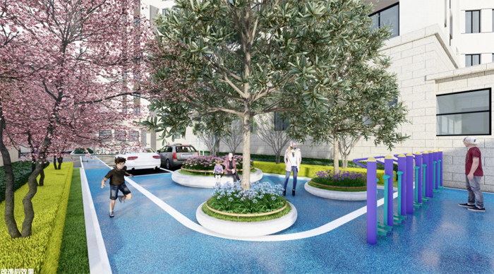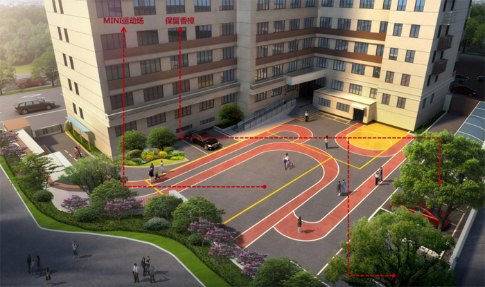 值得一提的是,小區將改造中庭庭院部分綠化,保留兩棵大香樟,用彩色瀝青劃分活動場地及多功能步道,在有限的公共空間內打造一處供居民休閑、鍛煉的迷你運動場,提升居住環境和面貌,改善居民生活品質。