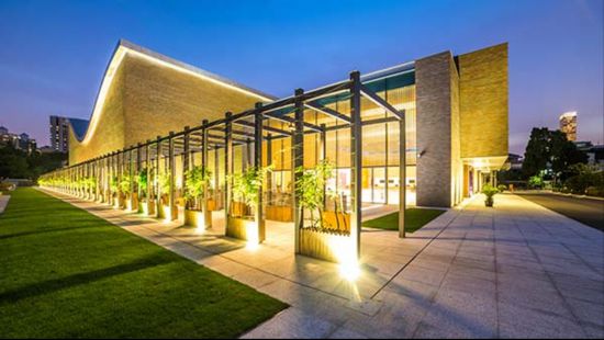上海交響樂團音樂廳由1200座演奏廳和400座的室內樂演奏廳組成。外部樸素的陶土磚和頂部靈動的曲面相結合,如同一本攤開的音樂總譜。