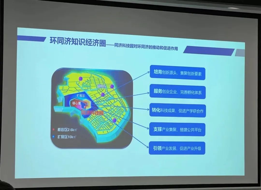 依托同濟大學獨特的學科和人才優勢、豐富的科研成果資源而建立,同濟科技園聚焦現代設計、電子信息、節能環保、生物醫藥、新能源、新材料等相關領域,積極承接大學知識外溢,為高??萍汲晒D化及知識型創業提供了適宜的發展環境和優質的綜合服務。在同級科技園與多方創新力量的協同努力下,“環同濟知識經濟圈”2021年年產值達到564億元。