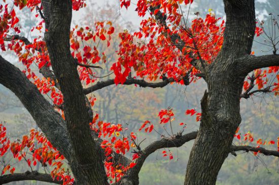 值得一提的是,在著名賞葉勝地北京香山,“貢獻”紅葉最多的既不是楓香,也不是槭樹或烏桕,而是一種名叫黃櫨的樹。黃櫨屬于漆樹科黃櫨屬。漆樹科和槭樹科同屬無患子目,所以黃櫨和槭樹算是遠親。但是,黃櫨植株比較矮小,是5米左右的小喬木,主要用于園林觀賞。黃櫨的葉片呈圓形,入秋后血紅如丹。北京香山生長了很多黃櫨,最后形成了層林盡染的美景。