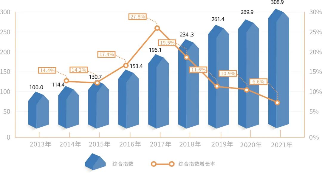 《報告》顯示:2021年,楊浦區持續鞏固疫情防控和經濟社會發展目標,進一步把創新創業創造引向深入,雙創發展韌勁與活力持續顯現。2021年楊浦雙創綜合指數為308.9(2013年為基期,基準值100),比上年度增長6.6%,且連續8年保持正增長,創新創業生態持續優化。