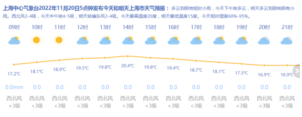 上海中心氣象臺2022年11月20日5點鐘發布今天和明天上海市天氣預報:多云到陰有短時小雨,今天下午轉多云,明天多云到陰轉陰有小雨。西北風3-4級,今天中午轉4-5級,明天轉偏東風3-4級。今天最高溫度20度,明天最低溫度15度。今天相對濕度60%-95%。
