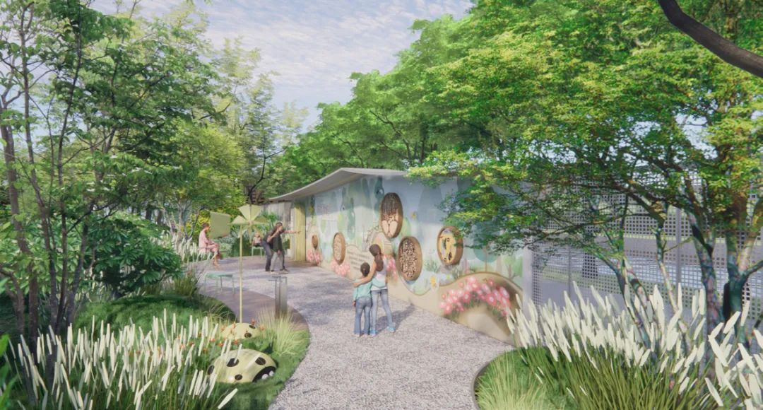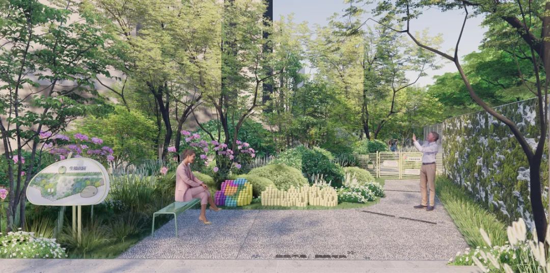從公布的效果圖可以看到,豐茂多樣的植物也是該花園的一大亮點。通過不同類型的植物群落,為多種野生動物提供生存條件,滿足它們對食物和棲息地的不同需求。全園植物景觀可分為入口體驗區、授粉者花園、雨水花園科普區、林下耐陰植物花園、水生生境展示區、科普展示區、生態秘境這7個主題區域。根據全園空間分區確定對應的植物主題,通過合理的植物分區營造,形成各有特色的植物景觀,同時滿足野生動物和社區居民對場地的不同使用需求,形成水韻留香的生態風貌。