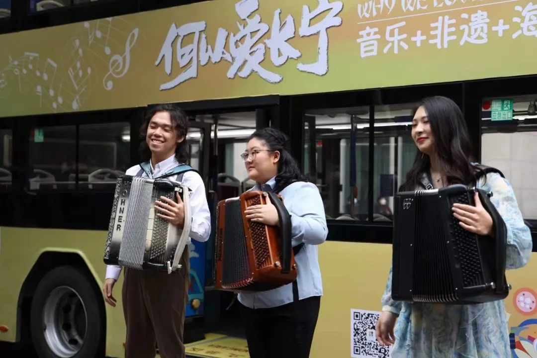 另一場則是“雙層巴士微旅行”。身披銀杏樹葉金黃色外衣的“何以愛長寧”雙層巴士穿行在長寧和上海的特色街區,報名參加微旅行體驗的游客們一路在手風琴的琴聲的伴隨下,且歌且行,用更沉浸的方式看上海,看長寧。這項長寧文旅在音樂演藝品牌上打造的特色項目,讓游客們更加真切地感受到了“建筑是凝固的音樂,音樂是流動的建筑”的深意。