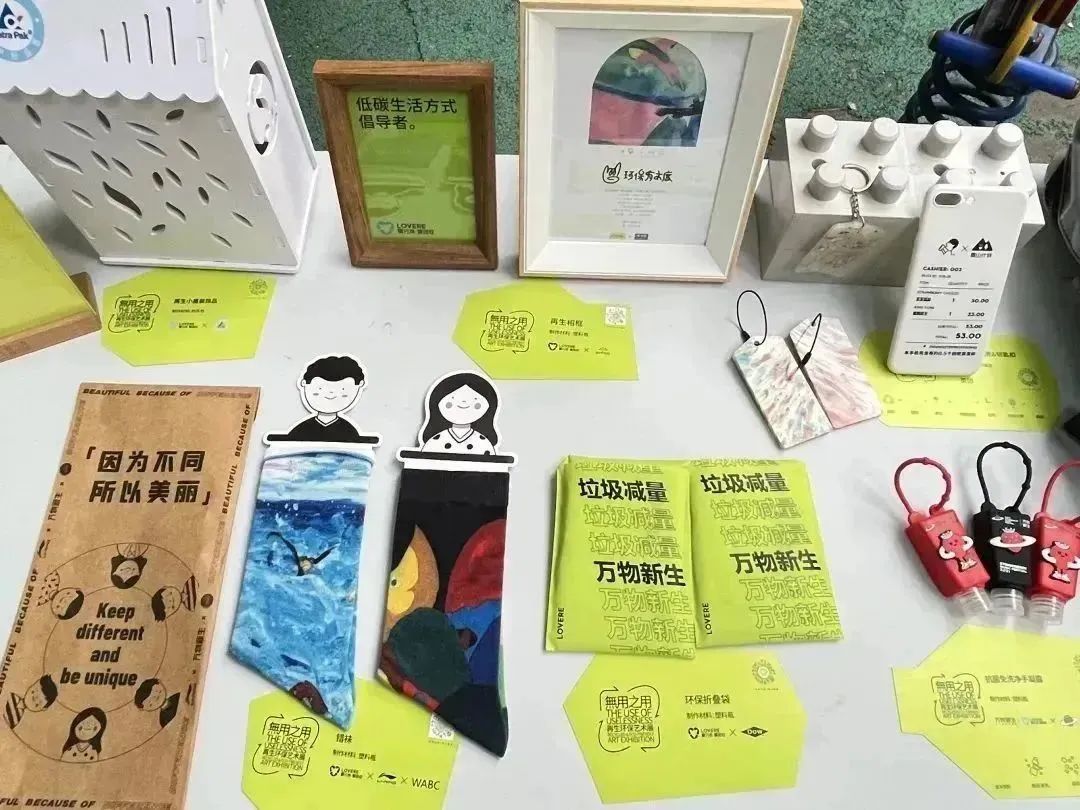在現場,“愛分類·愛回收”還專門設置了環保宣傳展臺,用廢棄塑料瓶制成的雨傘、用咖啡渣制成的T恤、用再生棉制成的眼罩、用編織袋制成的書包、用利樂包制成的飾品……琳瑯滿目的再生物品讓居民們大開眼界。