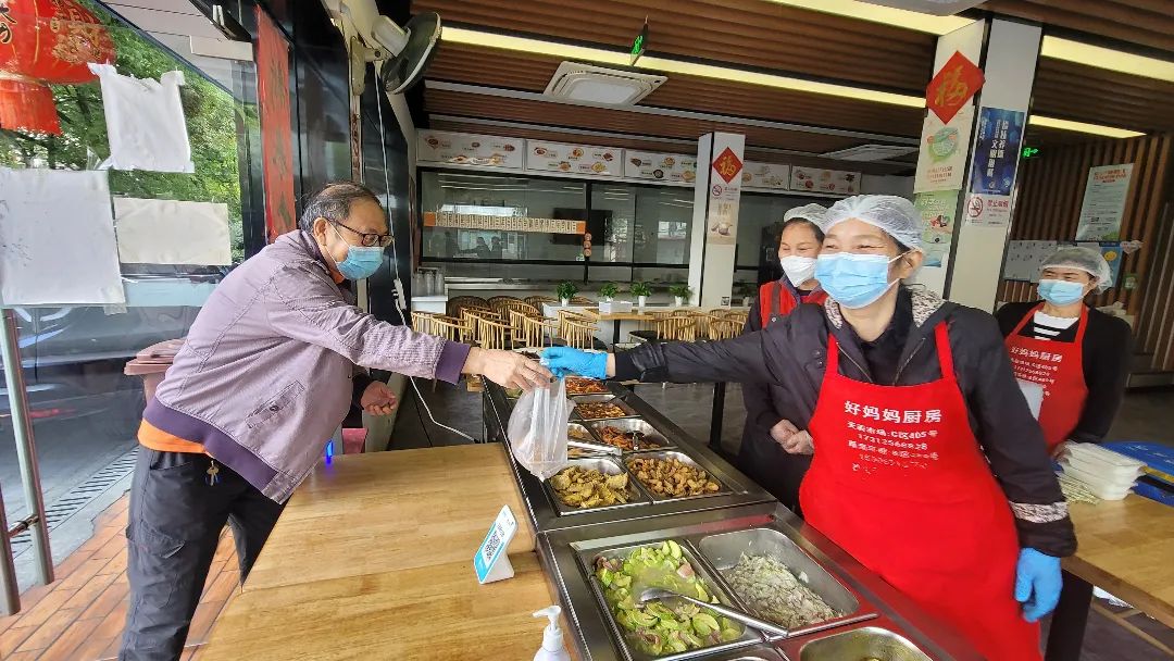 而在位于祥德路302號的社區長者食堂“歐陽社區生活館”(棲心小屋),記者看到,前來打包午餐的市民絡繹不絕。